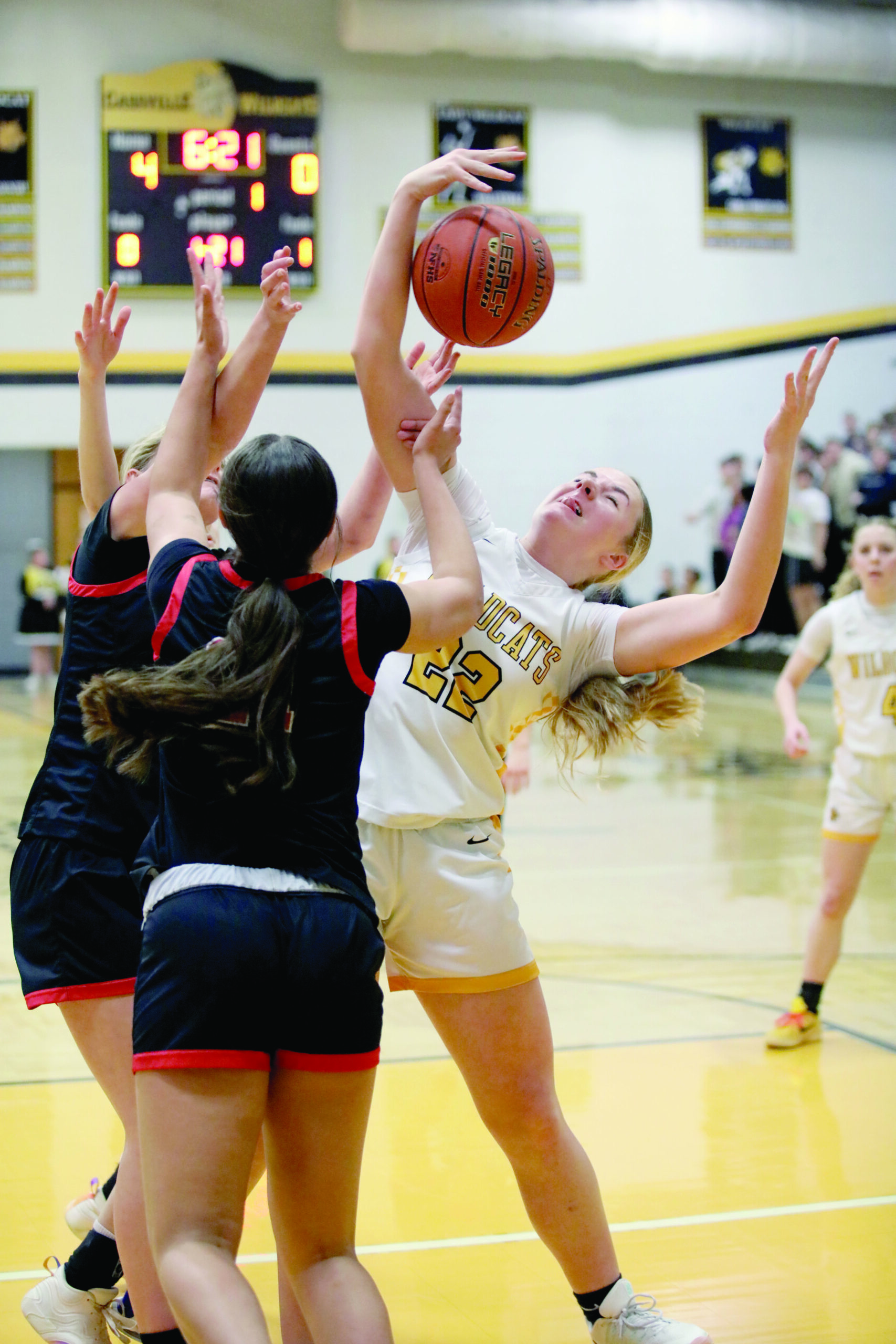 Cassville’s Alex Holycross reels in a rebound during action against Springfield Central on Thursday. The Lady Wildcats prevailed in the contest, 56-27.