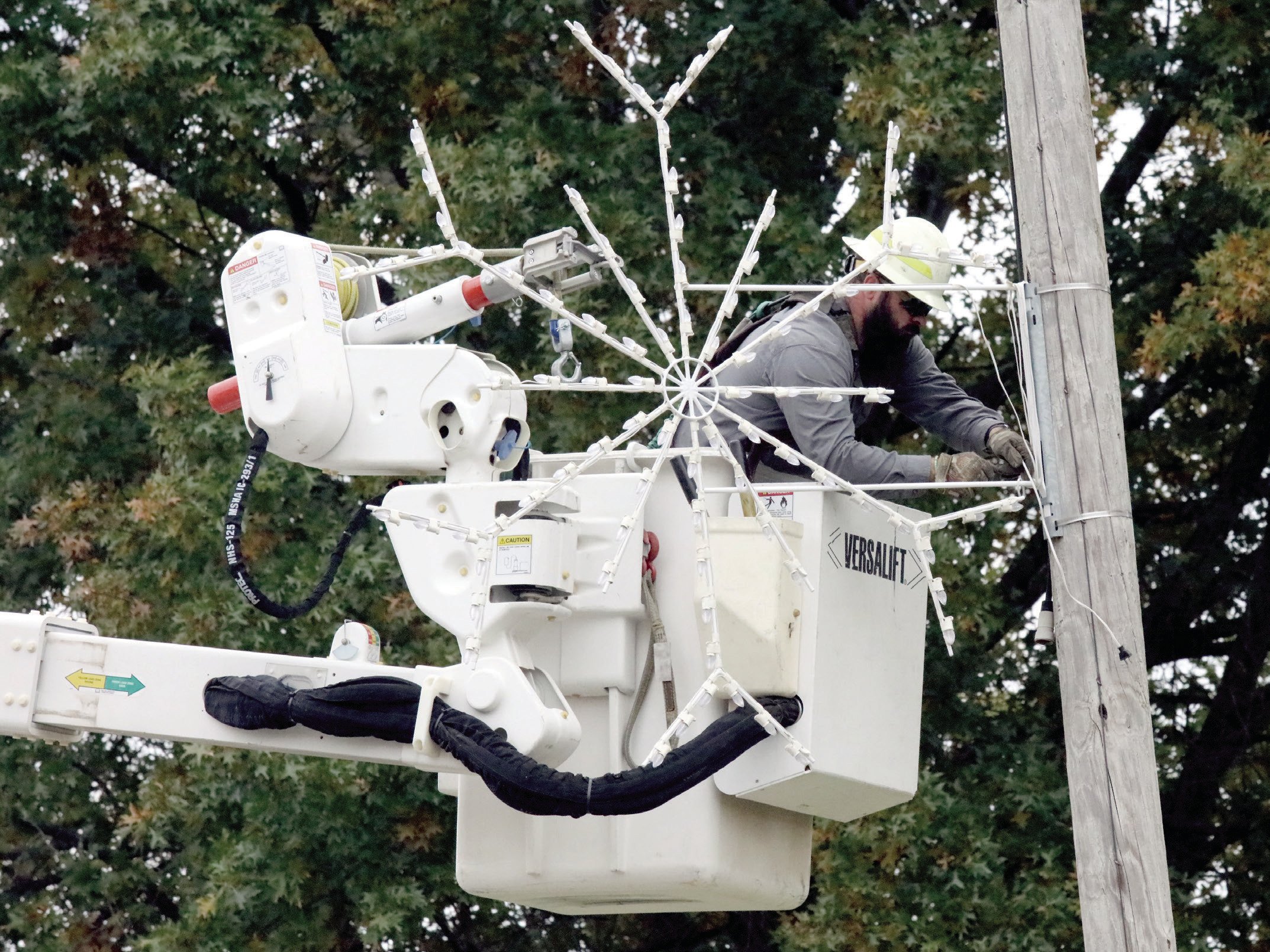 Drew Crain, lineman with Barry electric Cooperative, attaches a snowflake light display to a telephone pole in front of the Rock Gym at Cassville schools. The annual holiday decorations were installed along Main Street on Thursday morning, with Crain receiving assistance from fellow Lineman Billy Woods.