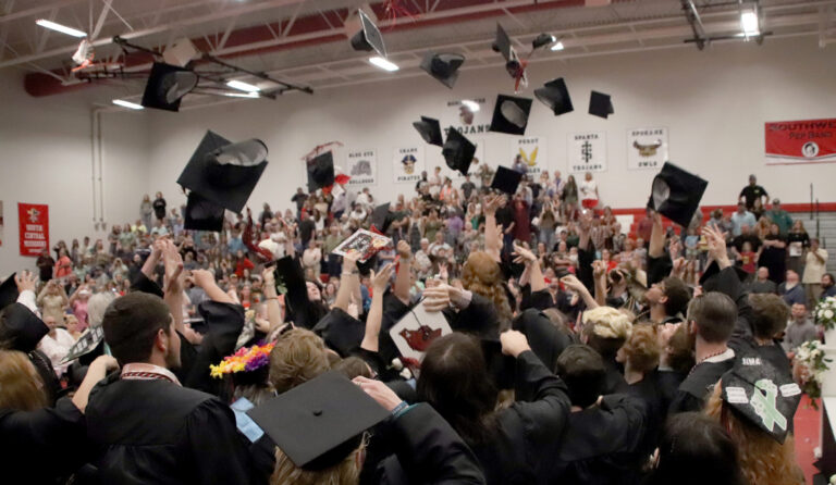 Southwest High School graduates toss their mortarboard hats in the air after the ceremony Thursday.