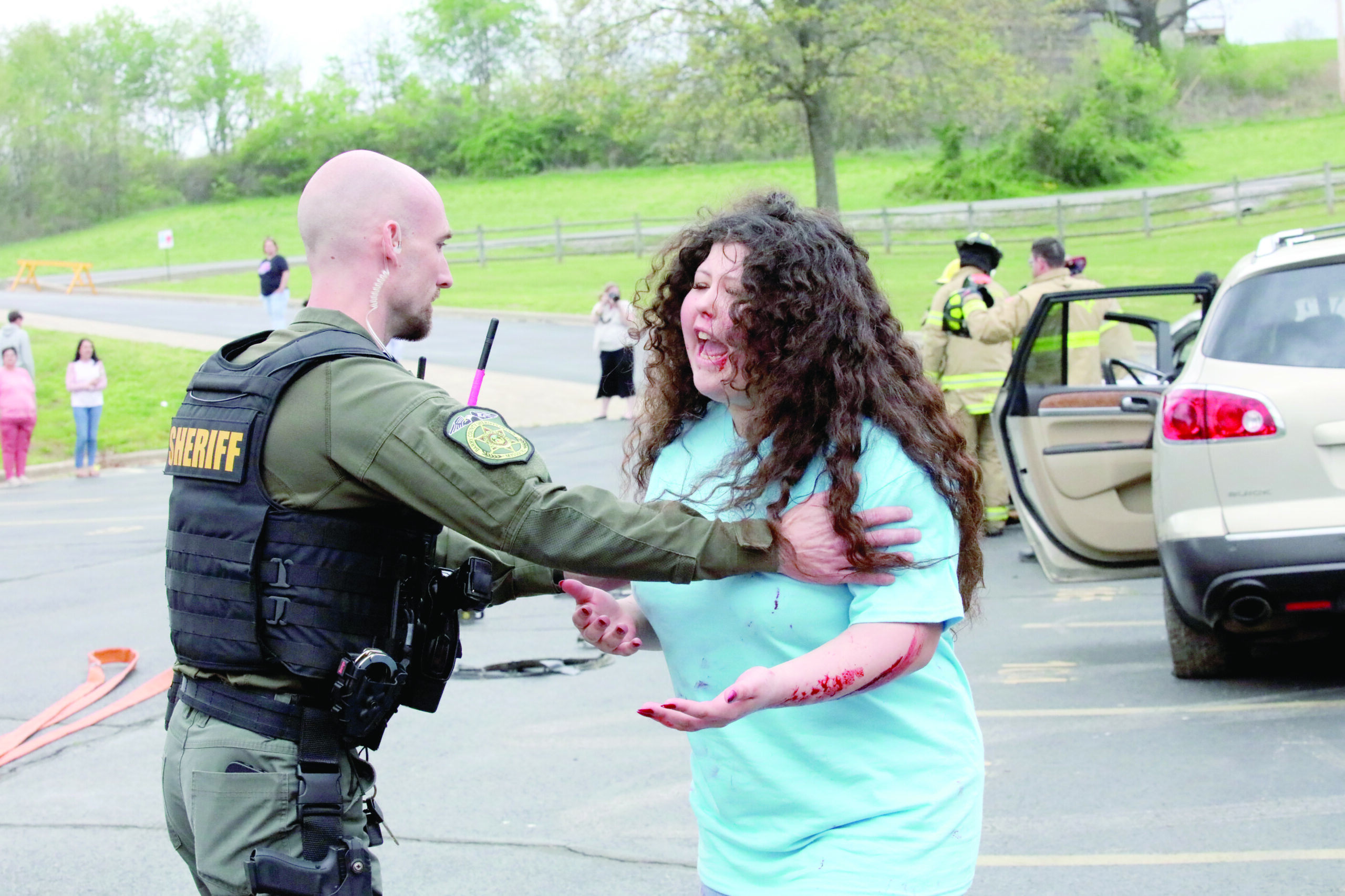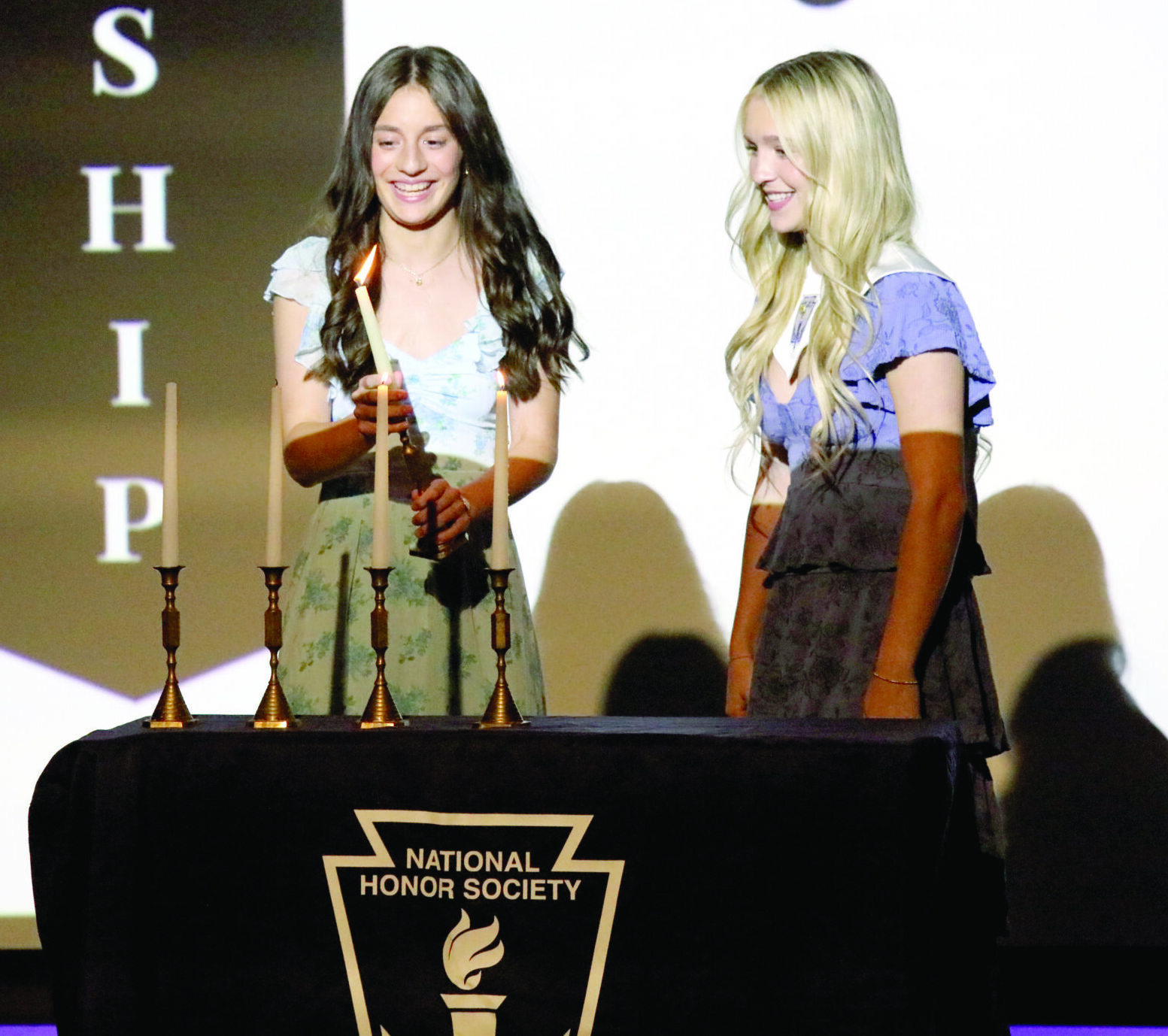 Brynn Whittenburg, left, smiles as she lights the Candle of Leadership during the Cassville High School National Honor Society Induction Ceremony on April 7. Looking on, at right, is Leadership Representative Nevaeh Johnson. Izaak Henbest lit the Candle of Character, and Audrey Kennedy lit the Candle of Service.