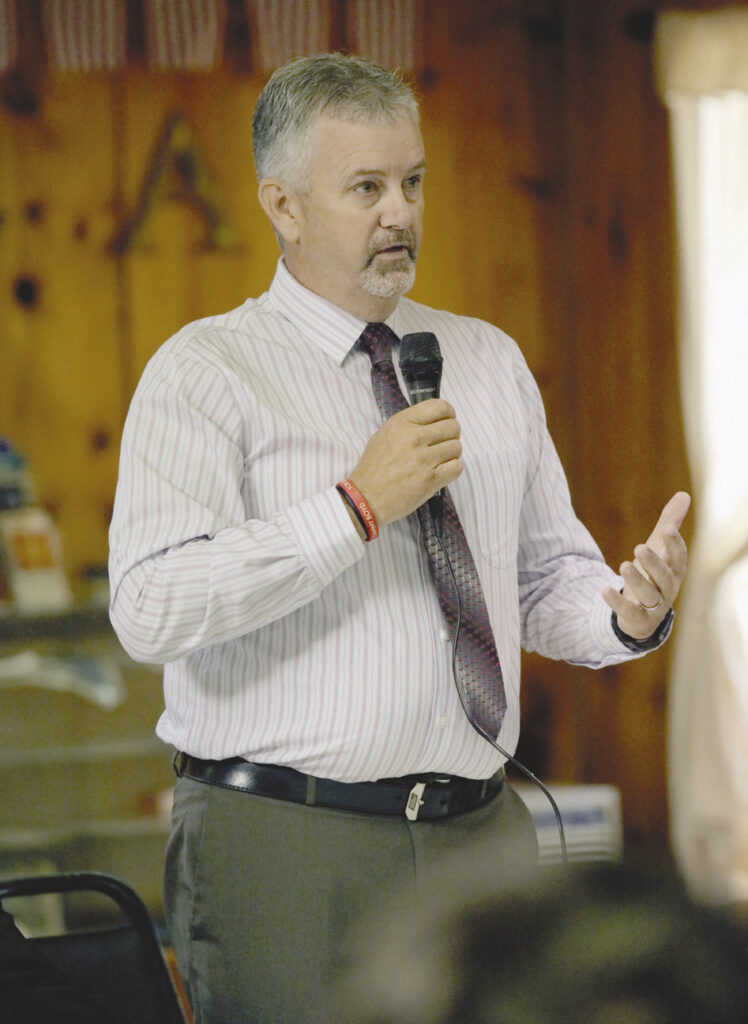 Randy Kalbaugh, current Stone County deputy and candidate for Barry County sheriff, speaks during the Eagle Rock Community Association debate on Friday in Eagle Rock. About 125 people attended the event. Kyle Troutman/[email protected]James Morgan, current current captain of criminal investigations division at Delaware County Sheriff’s Office in Oklahoma and candidate for Barry County sheriff, answers a question during the Eagle Rock Community Association debate on Friday in Eagle Rock. Candidates answered questions submitted by attendees and pulled from a hat for over an hour at the event. Kyle Troutman/[email protected]Danny Boyd, current Barry County sheriff seeking reelection, responds to a question at the Eagle Rock Community Association debate on Friday in Eagle Rock. Topics of questions ranged from controlling the drug problems in the county to the candidates’ favorite soft drink. Kyle Troutman/[email protected]