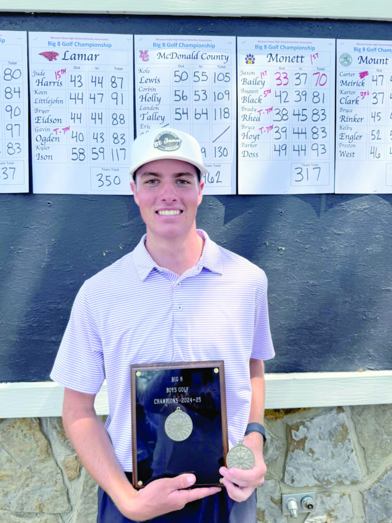 The Monett boys golf team won the 2025 Big 8 Conference championship. Jaxon Bailey, pictured, became a four-time Big 8 individual champion. August Black, Bryce Hoyt and Brady Rhea earned all conference honors for the team. Bailey and Black went on to compete at Class 4 Boys Golf State at Silo Ridge Golf & Country Club in Bolivar. Bailey finished tied for fifth with a 147 (71 and 76), and Black tied for 30th in the 97-player field with a 160 (74 and 86). Contributed photo
