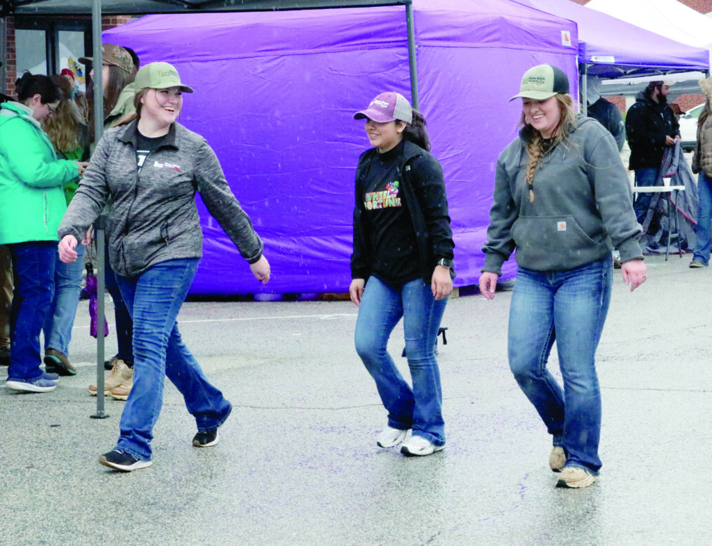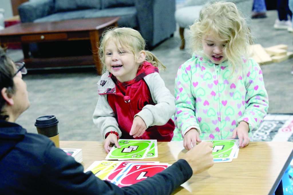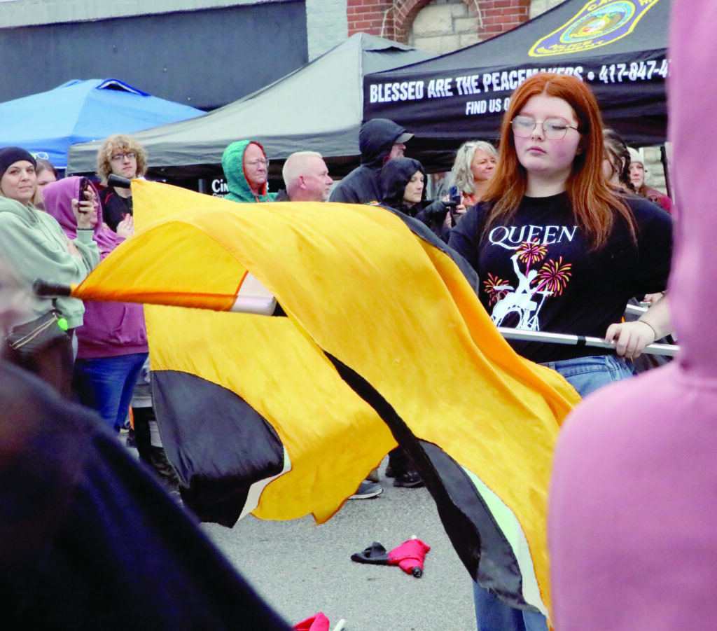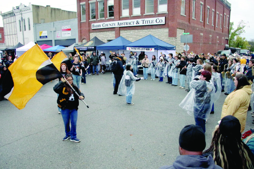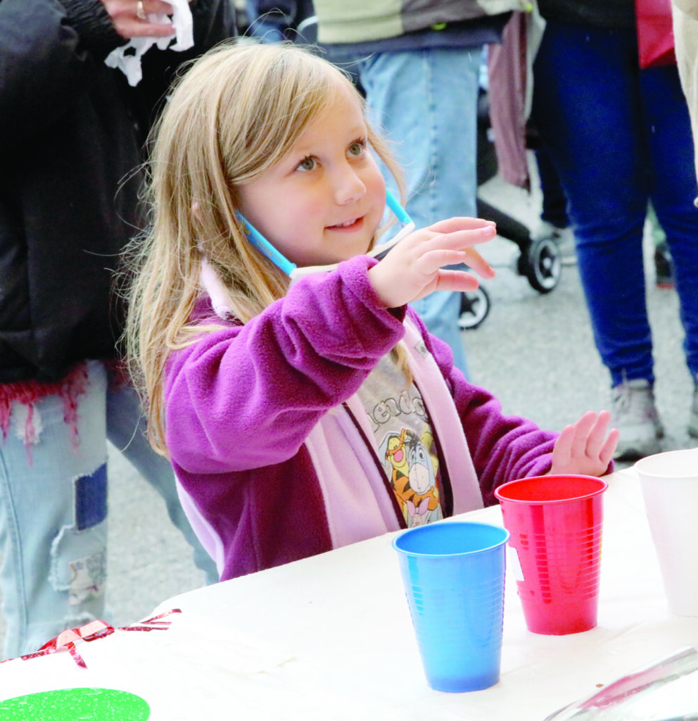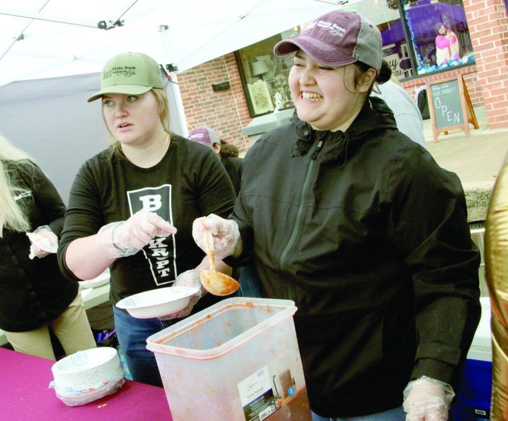 Lulu Sellars, left, 3, of Cassville, plays a larger than life version of Uno against her father with Audrey Hoover, 4, of Exeter in the First Baptist Church’s game area at the Cassville Chili & Salsa Cook-Off. Kyle Troutman/ktroutman@cassville-democrat.com Raelin Orr, 5, of Cassville, smiles at the reaction of dropping a voting bead into a cup at a booth at the Cassville Chili & Salsa Cook-Off on Saturday. Kyle Troutman/ktroutman@cassville-democrat.com Aubrey Conrad, of Cassville, waves a flag to simulate waves during a performance of “Cake by the Ocean” at the Cassville Chili & Salsa Cook-Off on Saturday. It was the first time in more than a decade, if ever, that the band gave a competition-level performance at the annual event on the courthouse square. Kyle Troutman/ktroutman@cassville-democrat.com Staff of First State Bank of Purdy walk up to accept the Best Decorated award for the First State Bank of Purdy at the Cassville Chili & Salsa Cook-Off on Saturday. The booth sported a Monopoly theme for the Game Night-themed Cook-Off. Kyle Troutman/ktroutman@cassville-democrat.com Jenna Crim, left, of Jenaroo Creations, paints the nose of Ty Hanavan, 7, of Olathe, Kan., en route to a tiger look Hanavan continued to wear at the Cassville Chili & Salsa Cook-Off on the square on Saturday. Kyle Troutman/ktroutman@cassville-democrat.com First State Bank of Purdy employees Lupe Medrano, right, and Jessica Smith combine to serve up a cup of salsa for a patron at the Cassville Chili & Salsa Cook-Off on Saturday. Kyle Troutman/ktroutman@cassville-democrat.com The Cassville Wildcat Pride Marching Band played their full competition list and other tunes at the Cassville Chili & Salsa Cook-Off on Saturday, a first for the band in recent memory. Kyle Troutman/ktroutman@cassville-democrat.com Xain Gray, of Cassville, accepts a cup of chili for tasting during the annual Cassville Chili & Salsa Cook-Off on the square on Saturday. Kyle Troutman/ktroutman@cassville-democrat.com