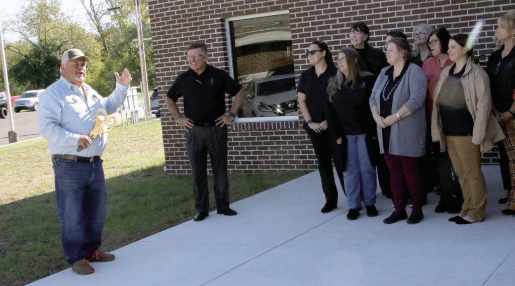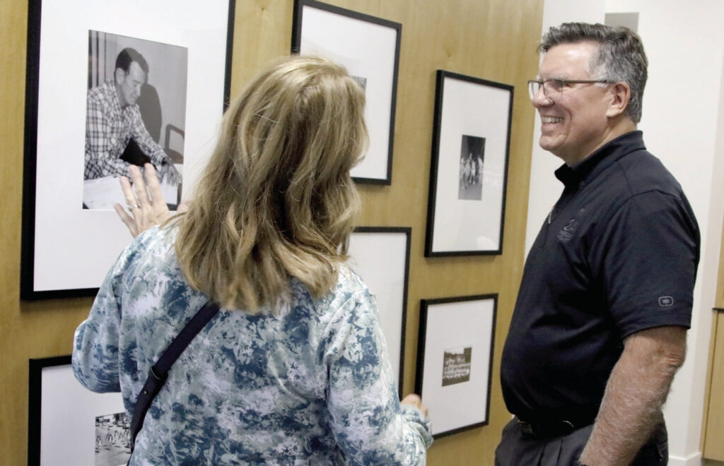Stan Kelley, CEO of Freedom Bank of Southern Missouri, speaks with his wife, Debbie Kelley, about the vintage photo prints lining the walls of the bank’s new facility, the ribbon for which was cut on Thursday. Kyle Troutman/ktroutman@cassville- democrat.comMike Carr, left, president of the Freedom Bank of Southern Missouri Board, speaks as the bank prepares to cut the ribbon on their new administrative facility in Cassville. The centralized area for back-room processing has 21 employees and can support 10-11 more, numbers needed after the bank started with 8 employees processing loans and credit matters. Freedom has more than 100 employees across six branches in southern Missouri. Kyle Troutman/ktroutman@cassville- democrat.com