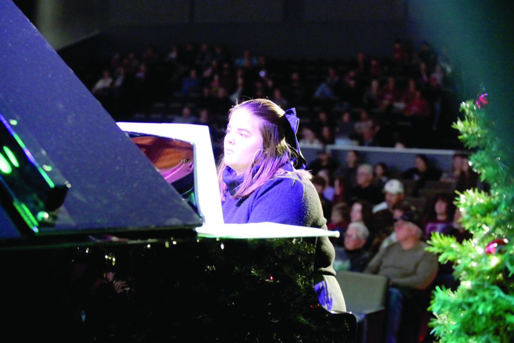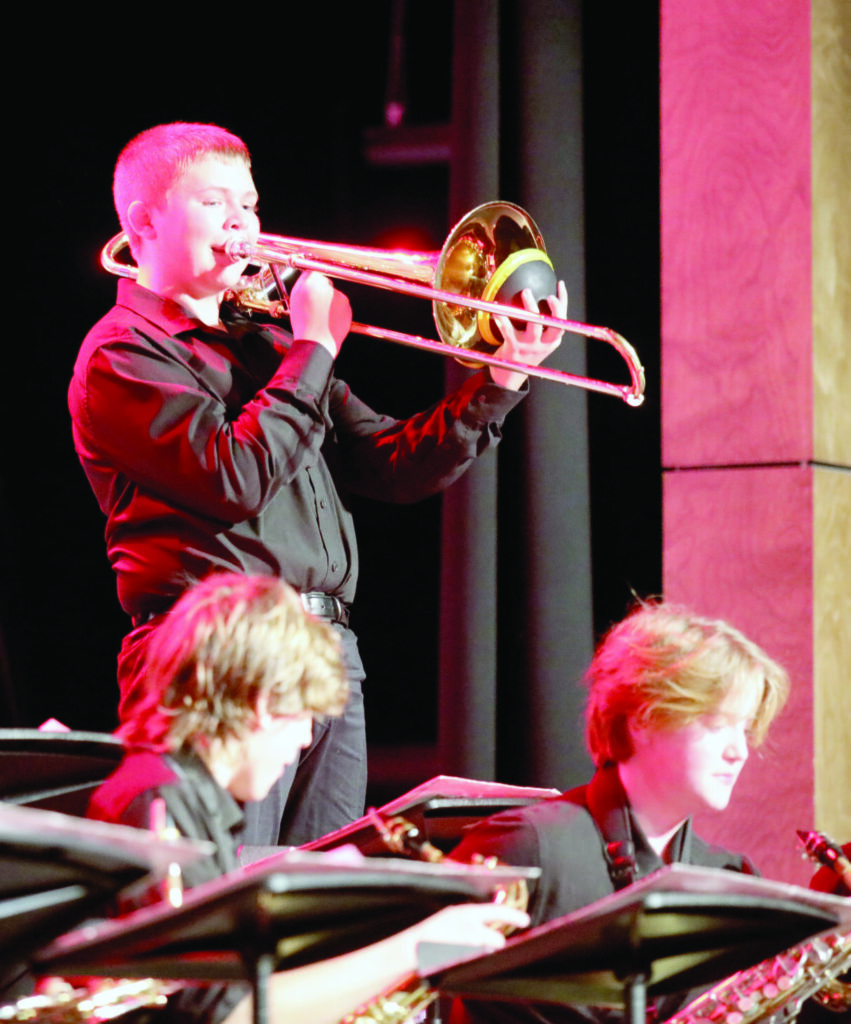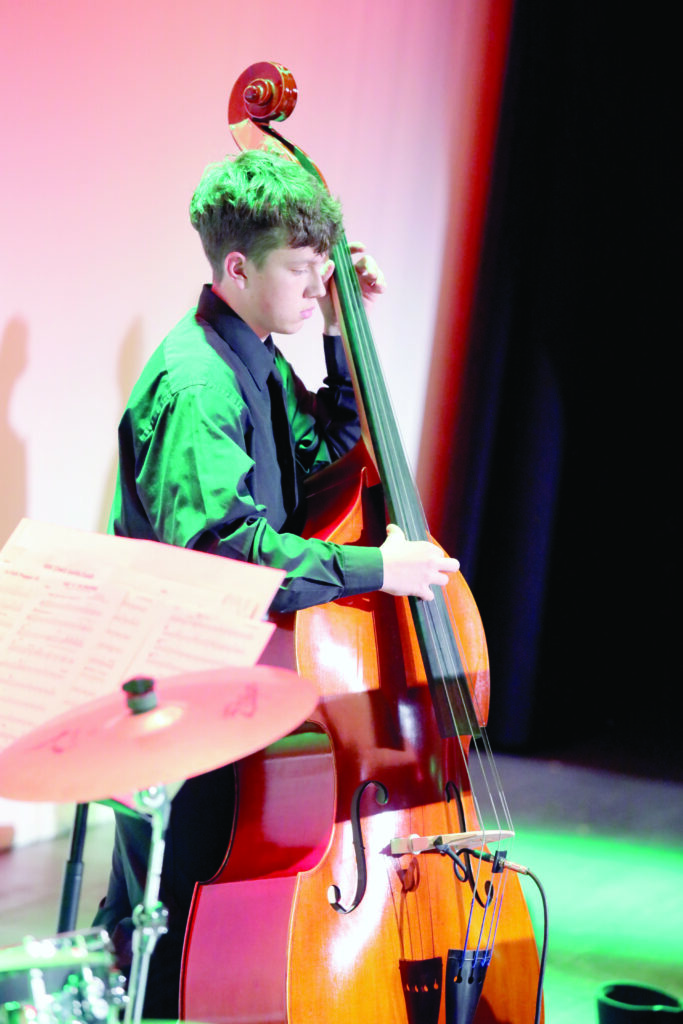 Cooper Phillips brought the soul on bass trombone during a solo performance at Thursday’s Wildcat Jazz Band concert at the Performing Arts Center. Kyle Troutman/[email protected] Aubrey Conrad plays the tubular bells during a Wildcat Pride Concert Band performance at the Performing Arts Center on Thursday. Kyle Troutman/[email protected]Jarrett Paul plays bass in the Wildcat Jazz Band during Thursday’s concert at the Performing Arts Center. Kyle Troutman/[email protected] Caiden Edie smiles as he plays bells during Thursday’s Wildcat Jazz Band concert at the Performing Arts Center. Kyle Troutman/[email protected] Jacie Hudson plays piano in the Wildcat Jazz Band during a Christmas-themed performance at the Performing Arts Center at Cassville High School on Thursday. Kyle Troutman/[email protected]
