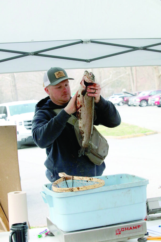 Jacob Eidel, of Humboldt, Kan., removes his 5.45-pound trout from the lunker weigh station on Opening Day. The 27-year-old said he’s been fishing since he was 5, and this was his first-ever lunker. Kyle Troutman/[email protected]