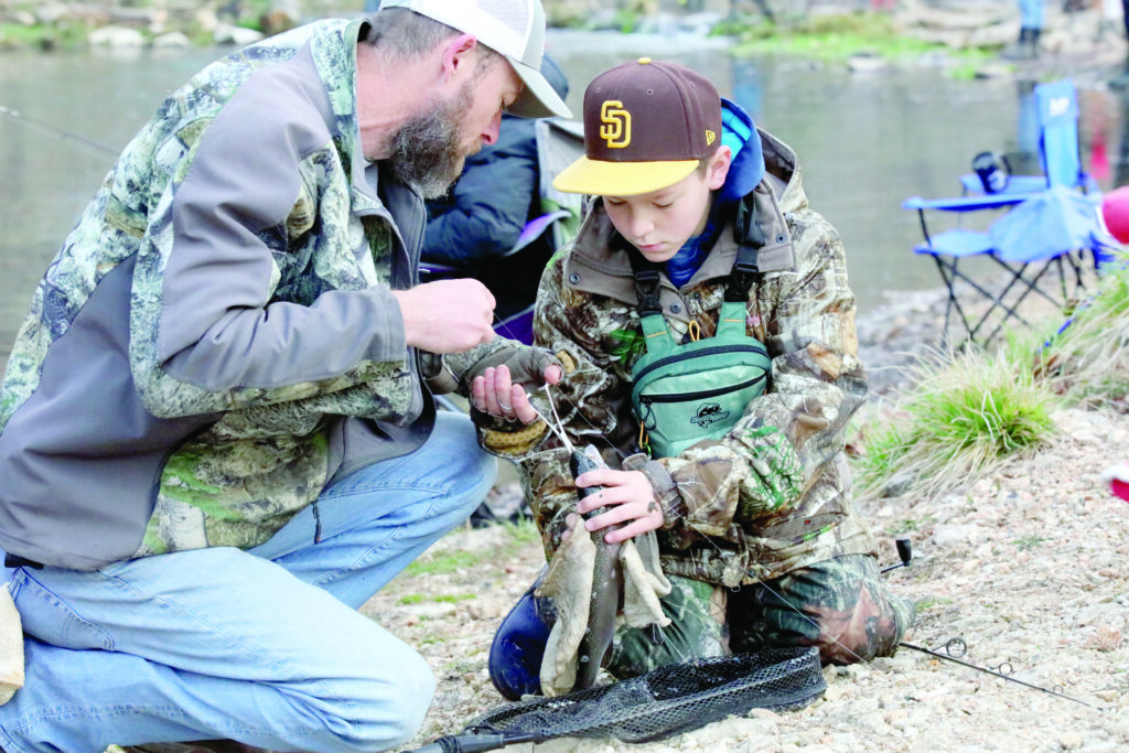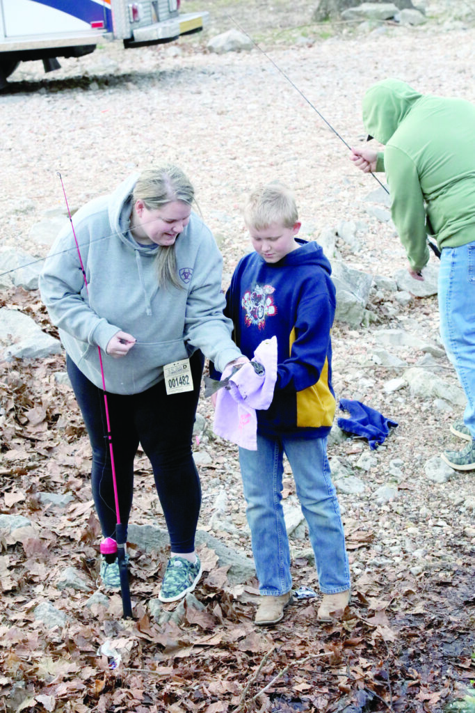 Young anglers were sprinkled throughout the park on Sunday, making memories with family and friends as they fished together. Jake Henderson, of Purdy, had his 6-year-old son, Corbin Henderson, with him on the banks on net duty.