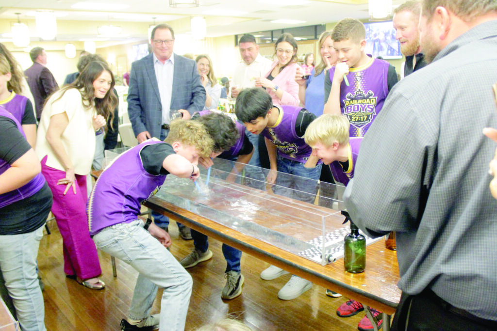 The event served as a fundraiser for the Railroad Boys 7v7 touch football team, whose members volunteered to be “auctioned” as jockeys, using a straw to blow air or squirt guns to encourage the fish. Professional auctioneers Jason and Britini Bates ran the event and the auction. The 16 fish in the races raised $2,910. The boys earned $750 to help their team from their efforts.