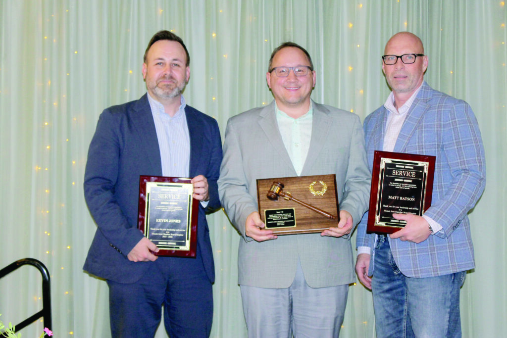 Outgoing members of the Chamber board received plaques for their term of service. Coming forward to accept their honor were Kevin Jones and Matt Batson, along with Brad Hill, who was recognized as a past president, stepping into that role when President Mary Dutton resigned. His plaque included a gavel in recognition of that service.