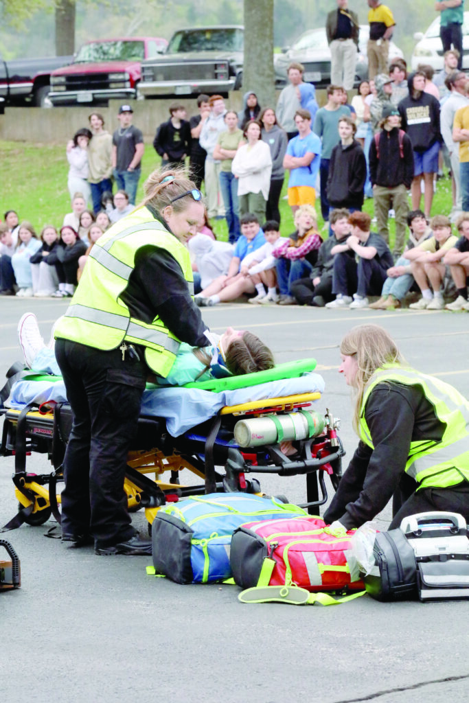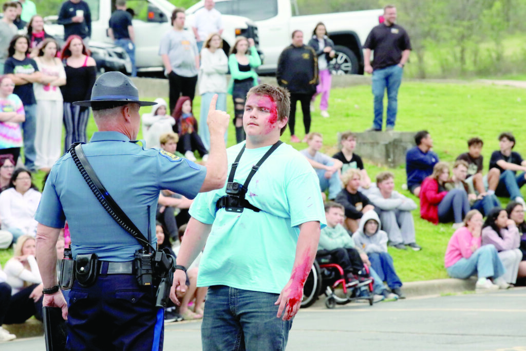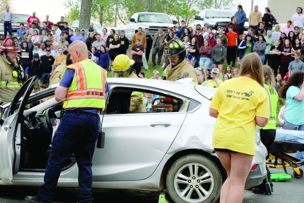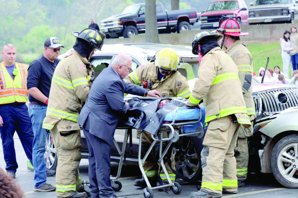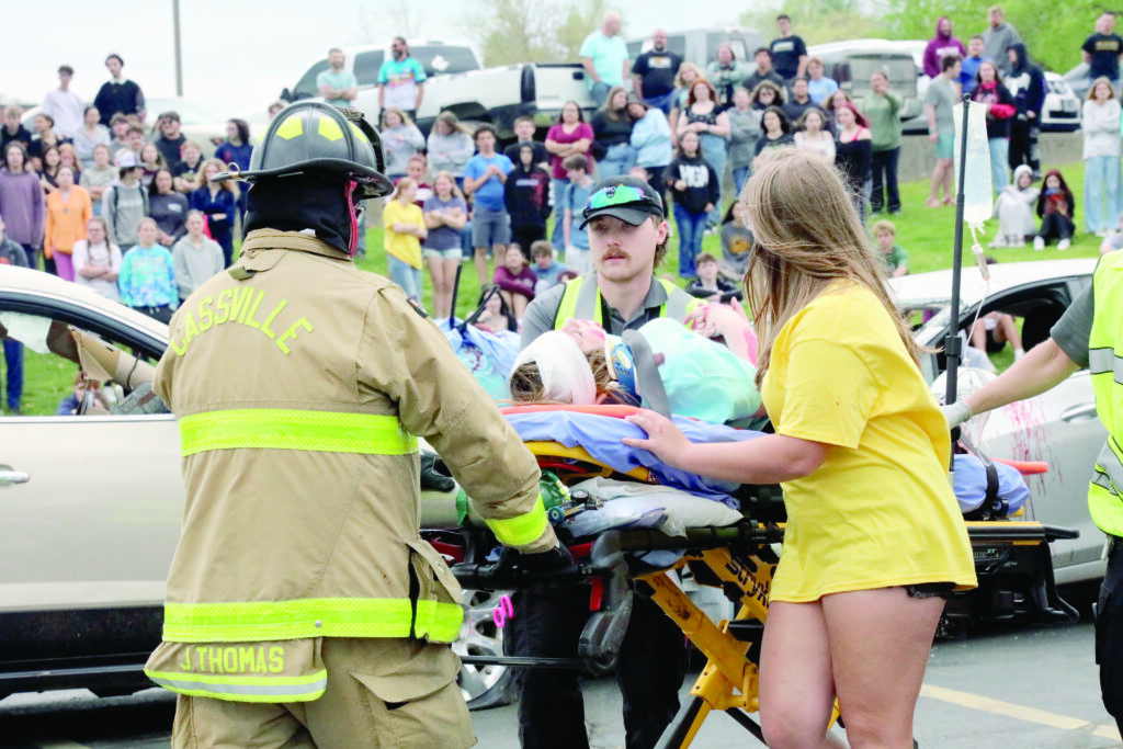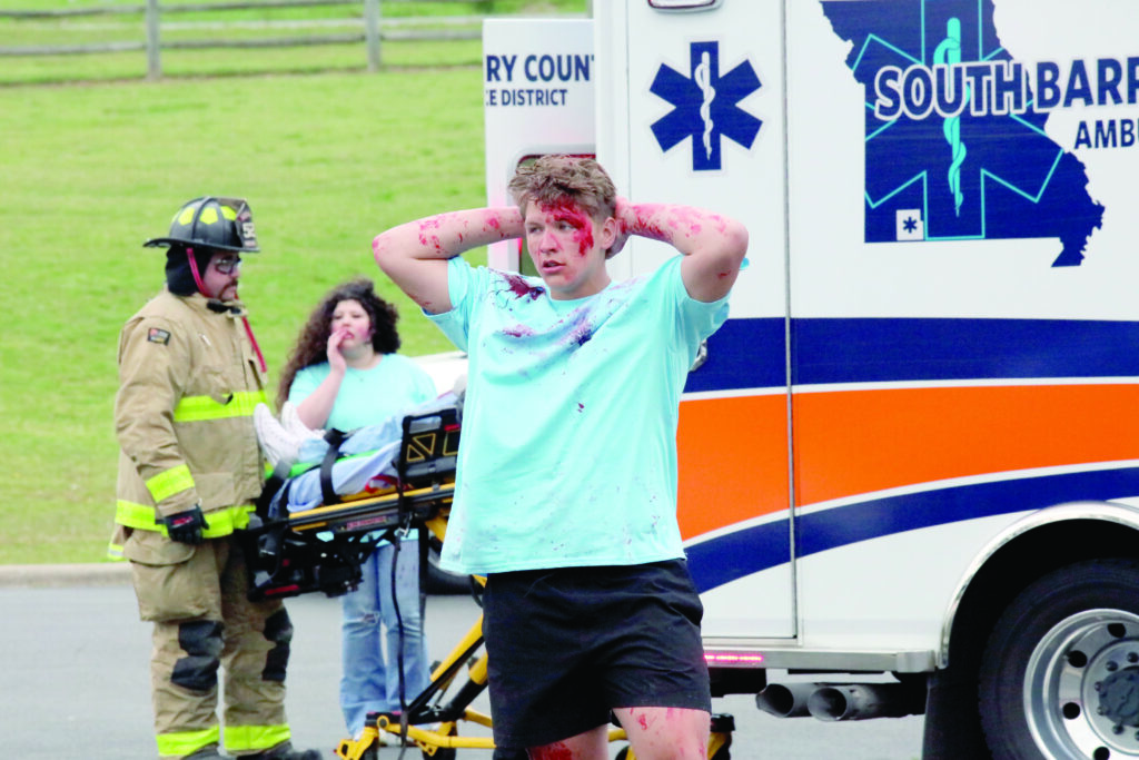 Shelby Knoefler, right, holds the hand of Kenzie Davis, on the stretcher, as she is wheeled into an ambulance by EMS and Cassville Fire personnel as part of a staged drunk driving crash at Cassville High School on Friday. Kyle Troutman/[email protected] Isaac Luney performs in the drunk driving docudrama at Cassville High School on Friday. Kyle Troutman/[email protected] Ethan Sizemore, right, wobbles backward as he is given a sobriety test by a state trooper as part of a staged drunk driving crash at Cassville High School on Friday. Kyle Troutman/[email protected] Cooper Hendrix, whose head can be seen at the top of the bodybag on the coroner’s stretcher, played one of the victims in a staged drunk driving crash at Cassville High School on Friday. Kyle Troutman/[email protected]EMS personnel perform CPR on a victim, played by Kenzie Davis in the staged drunk driving docudrama at Cassville High School on Friday. Kyle Troutman/[email protected] Cassville firefighters use the jaws of life to release a victim in a staged drunk driving crash at Cassville High School on Friday. The docudrama, presented every four years by Students Against Destructive Decisions, includes local fire, police, EMS, the coroner and a towing company to show students what can happen in the event of a crash due to drunk driving. Kyle Troutman/[email protected]